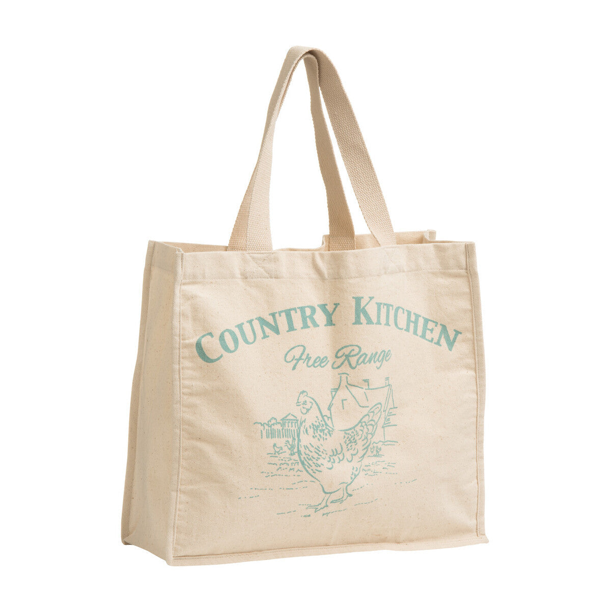 This cotton canvas shopping bag in natural colour is sturdy enough to carry the stuff with its dual handles. It features hen design and 'country kitchen' worded detail in green that is accentuated on its natural base.