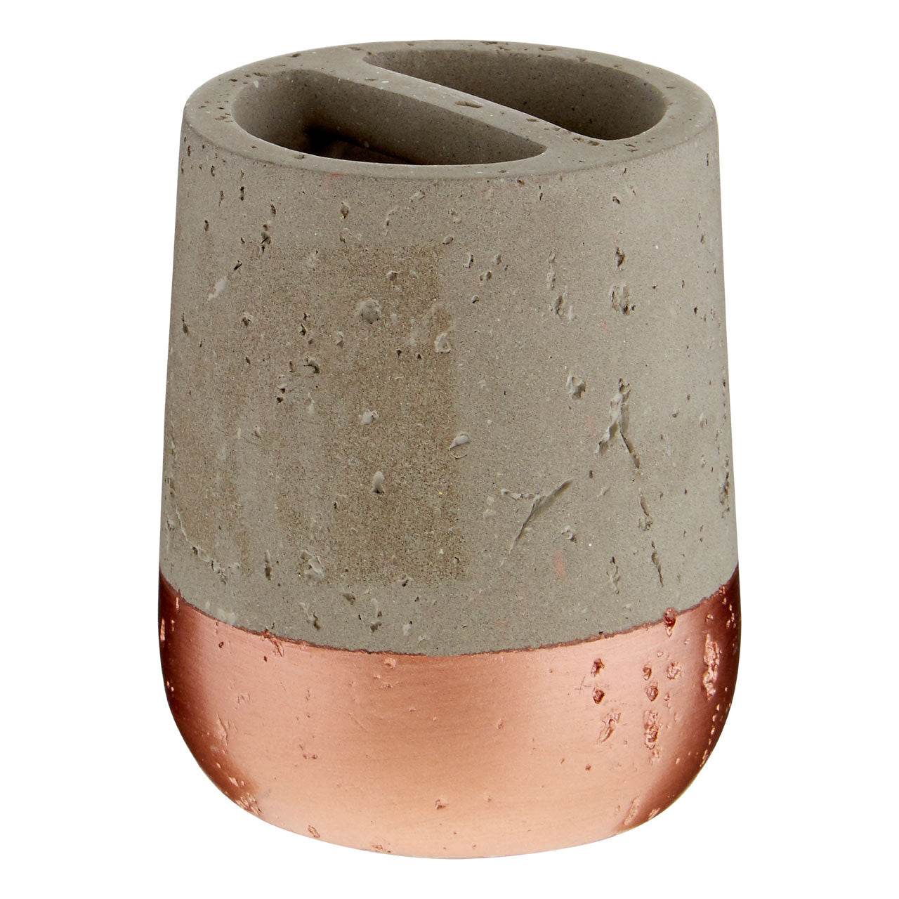 The base of this distinctive toothbrush holder has a warm copper finish, its surface exhibiting small markings that add character. The grey concrete creates a counterpoint to the reflective copper metal, and both combine to produce a luxurious effect. A segmented rim allows for toothbrushes to be kept separate.