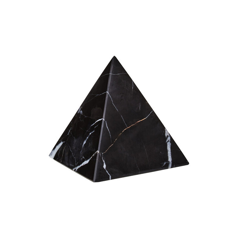 This black marble sculpture features strong white veining, which will complement a variety of interiors. The sleek pyramid design will add to the contemporary aesthetic of the marble.